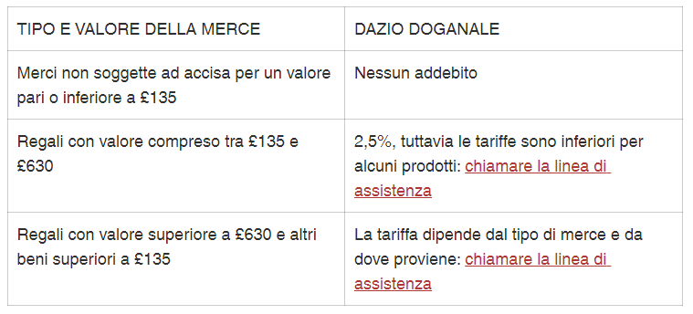 Ci verranno addebitati i dazi doganali su tutte le merci inviate al di fuori del Regno Unito (o del Regno Unito e dell'UE se ci troviamo in Irlanda del Nord) se sono: