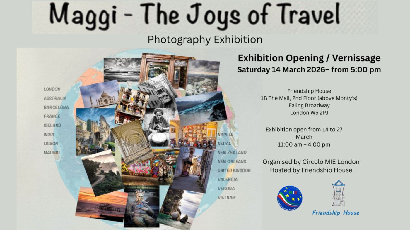 Il Circolo MIE di Londra, in collaborazione con la Friendship House di Ealing Broadway, è lieto di presentare l’inaugurazione della mostra fotografica “Maggi – The Joys of Travel”, in programma sabato 14 marzo a partire dalle ore 17:00 presso la Friendship House, nel cuore di Ealing Broadway.