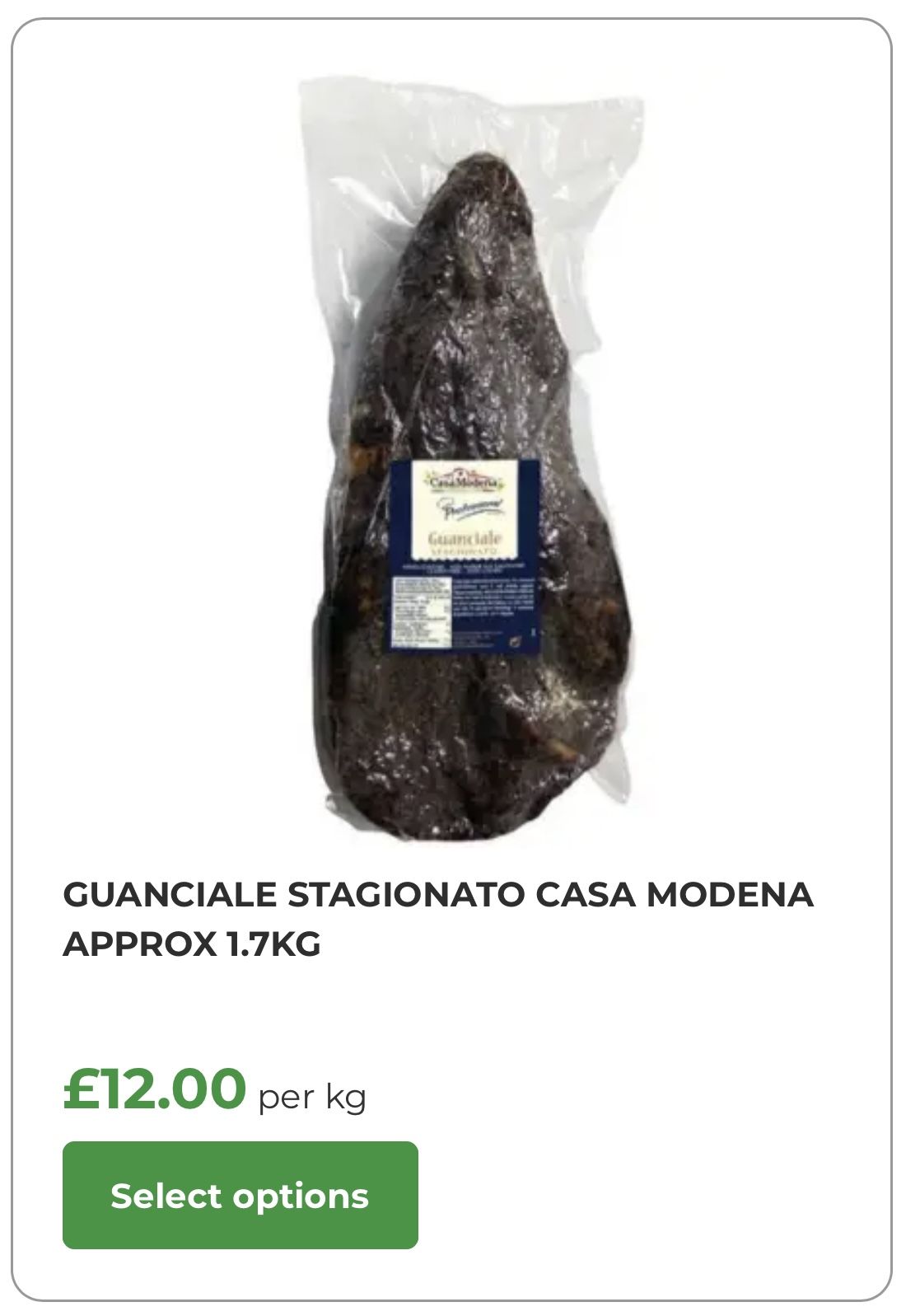 - Guanciale nazionale stagionato Casa Modena: £12.00 per kg.