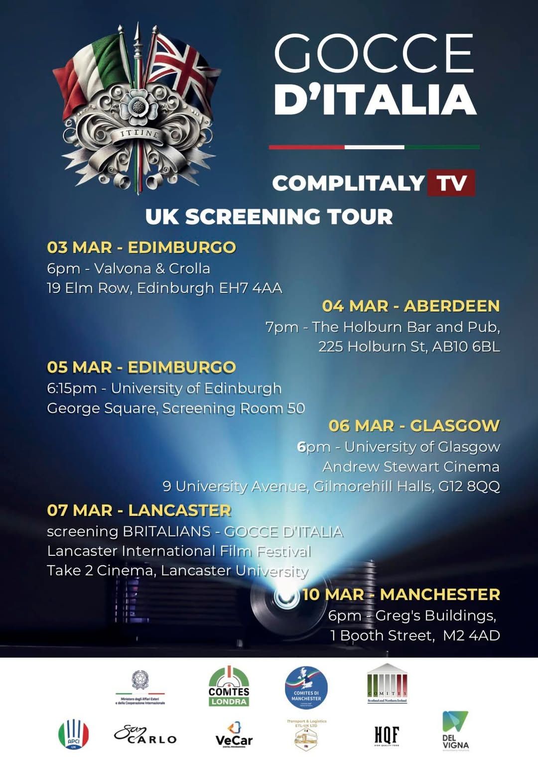 Il tour è reso possibile grazie al supporto di: Consolato Generale d’Italia a Edimburgo, Ministero degli Affari Esteri e della Cooperazione Internazionale, COMPLITALY TV, Valvona & Crolla, The University of Edinburgh, The University of Glasgow, Del Vigna LTD.