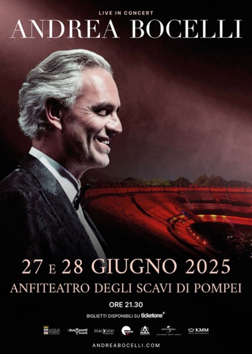 Il concerto del Maestro Bocelli inaugura ufficialmente la stagione estiva musicale del Parco Archeologico di Pompei, aprendo la strada a una serie di eventi internazionali che vedranno protagonisti artisti di fama mondiale. Organizzato da DuePunti Eventi, in collaborazione con Klassics Music Management e Almud Edizioni Musicali, questo doppio appuntamento si inserisce in un progetto culturale di grande respiro, che vuole rilanciare Pompei come destinazione di eccellenza per il turismo culturale.