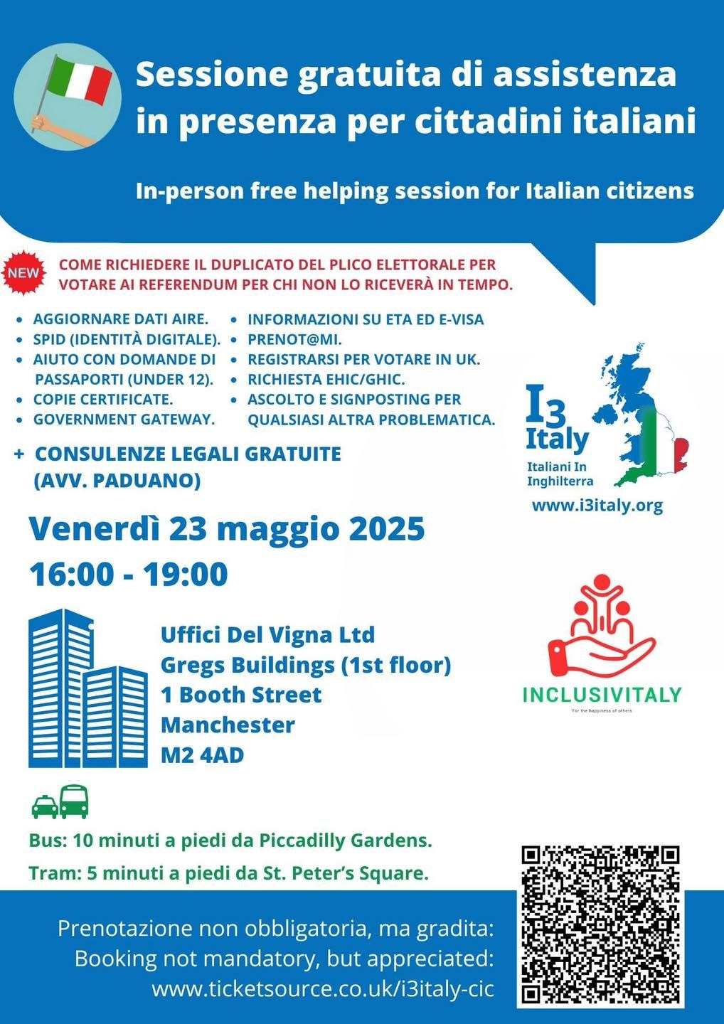 Venerdì 23 maggio, dalle 16.00 alle 19.00, presso gli uffici di Del Vigna Ltd, situati al primo piano dei Gregs Buildings, 1 Booth Street (M2 4AD), si terrà un evento gratuito dedicato alla comunità italiana residente nel Regno Unito. L’iniziativa è organizzata in collaborazione con Inclusivitaly e I3Italy, due realtà attive nel supporto agli italiani all’estero.
