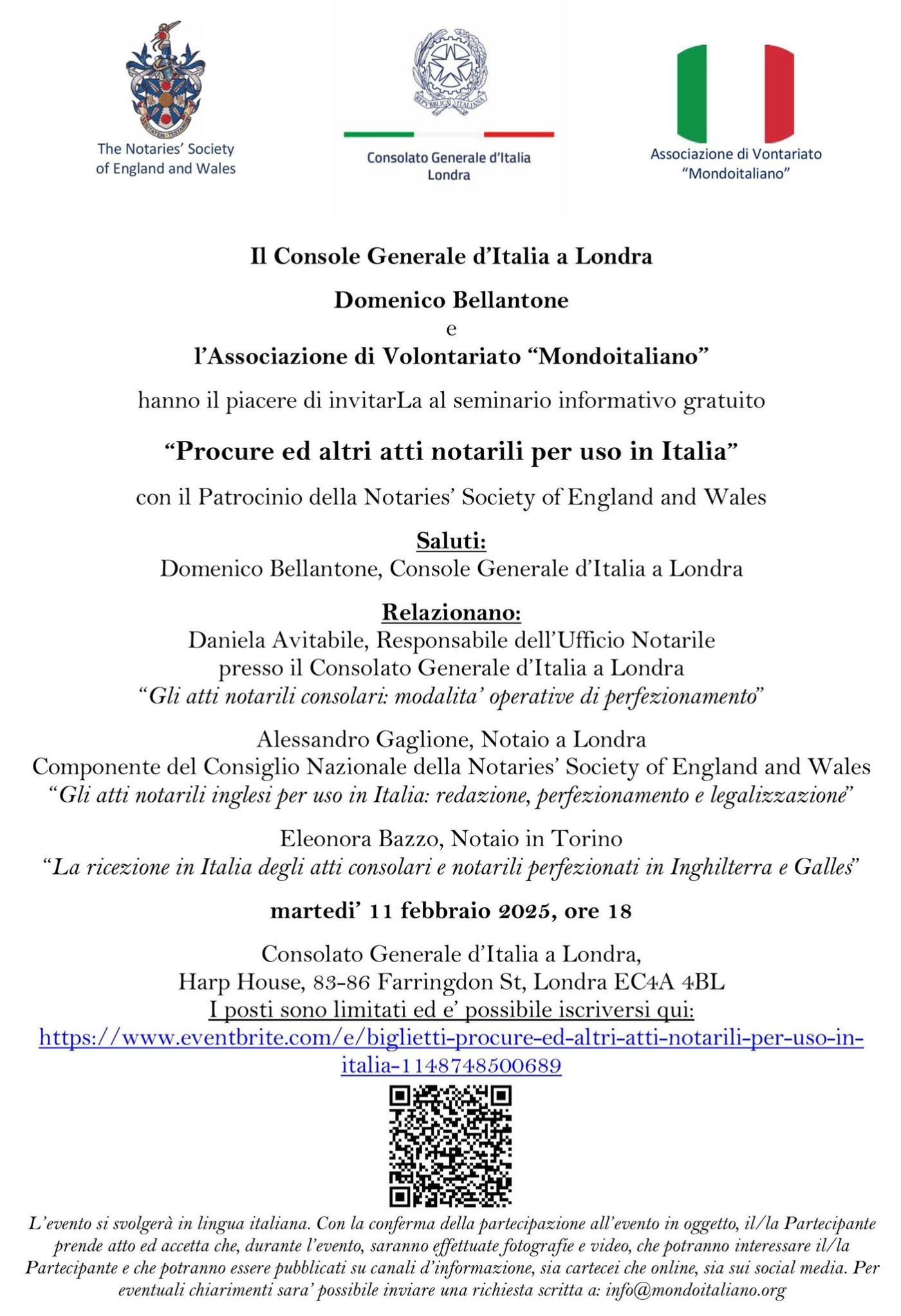 Il Console Generale d'Italia a Londra, Domenico Bellantone, insieme all'Associazione di Volontariato "Mondoitaliano", ha il piacere di annunciare un seminario informativo gratuito intitolato "Procure ed altri atti notarili per uso in Italia". Questo evento, patrocinato dalla Notaries' Society of England and Wales, si terrà martedì 11 febbraio 2025 alle ore 18:00 presso il Consolato Generale d'Italia, situato in Harp House, 83-86 Farringdon St, Londra, ECAA 4BL.