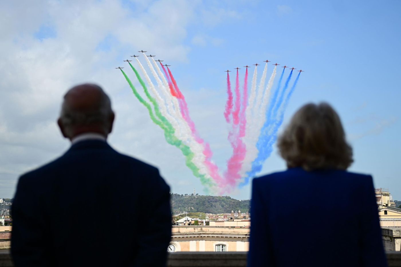 Dal terrazzo delle statue del Quirinale, Re Carlo e la Regina hanno potuto assistere al suggestivo passaggio delle Frecce Tricolori, che hanno colorato il cielo romano con le sfumature della bandiera italiana, regalando un momento di grande emozione. Presente all’incontro anche il Ministro degli Esteri Antonio Tajani, coinvolto nei colloqui bilaterali.