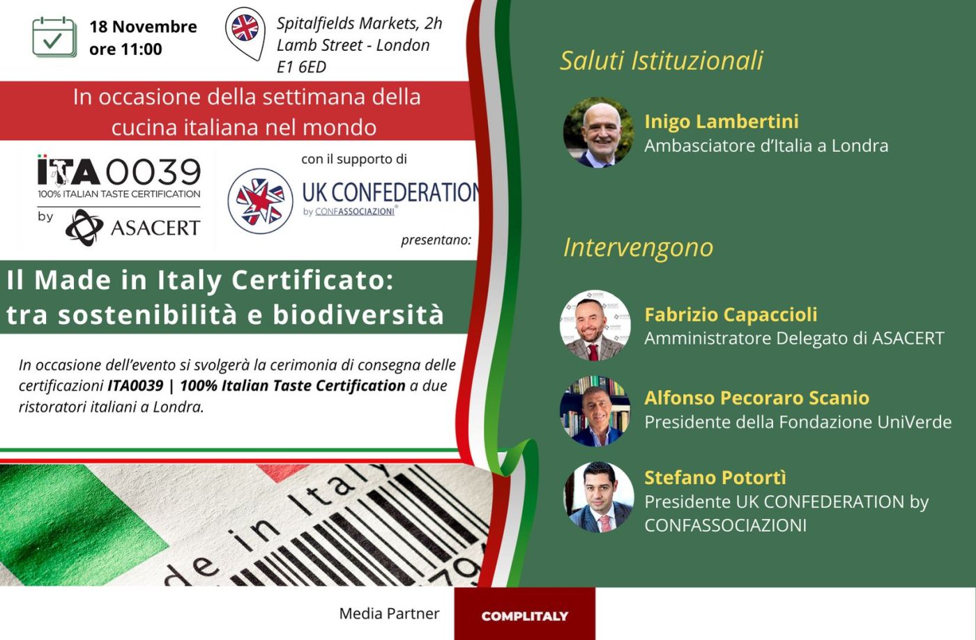Il 18 Novembre alle ore 11, Spitalfields Market a Londra sarà il palcoscenico di un evento straordinario: la presentazione del "Made in Italy Certificato: tra sostenibilità e biodiversità”, organizzato da UK Confederation by Confassociazioni in occasione della Settimana della Cucina Italiana nel Mondo 2023. Media Partner dell’evento è Complitaly TV.