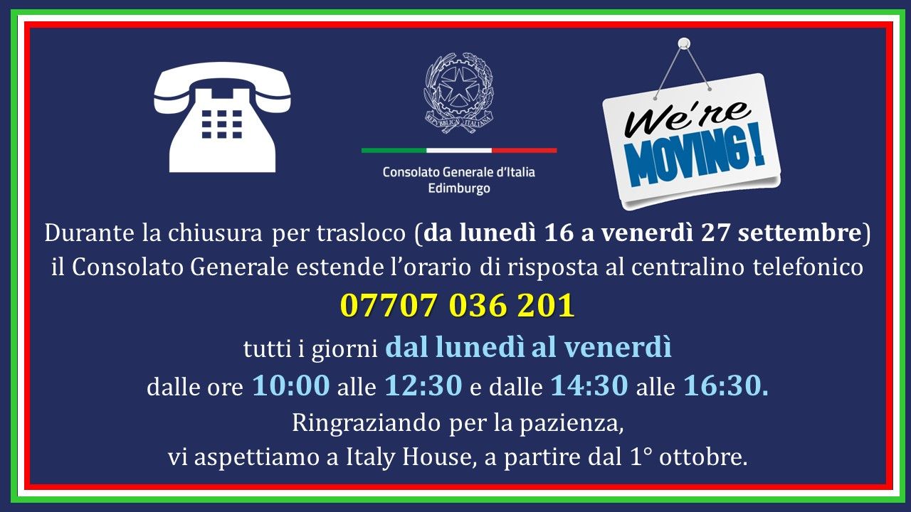 Il Consolato Generale d'Italia a Edimburgo chiuderà temporaneamente dal 16 al 27 Settembre per consentire il trasloco in una nuova sede. Durante questo periodo, i servizi consolari saranno sospesi, ma la reperibilità sarà garantita tramite un'estensione dell'orario del centralino telefonico.