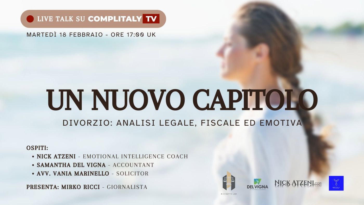 Per rispondere a queste domande, domani, martedì 18 febbraio alle ore 17:00 UK, Complitaly TV ospiterà un live talk dal titolo "Un Nuovo Capitolo: Divorzio, Analisi Legale, Fiscale ed Emotiva". La trasmissione, condotta dal giornalista Mirko Ricci, vedrà la partecipazione di tre esperti che offriranno un'analisi approfondita sulle sfide e sulle opportunità legate al divorzio.