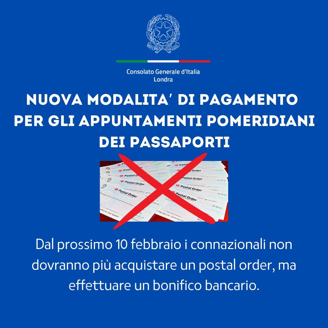 Il Consolato Generale d'Italia a Londra prosegue con determinazione il suo impegno per offrire servizi sempre più efficienti e in linea con le esigenze della comunità italiana residente nel Regno Unito. Con l'obiettivo di semplificare le procedure amministrative e migliorare l'esperienza degli utenti, il Consolato ha annunciato un'importante novità riguardante il pagamento delle pratiche relative ai passaporti.
