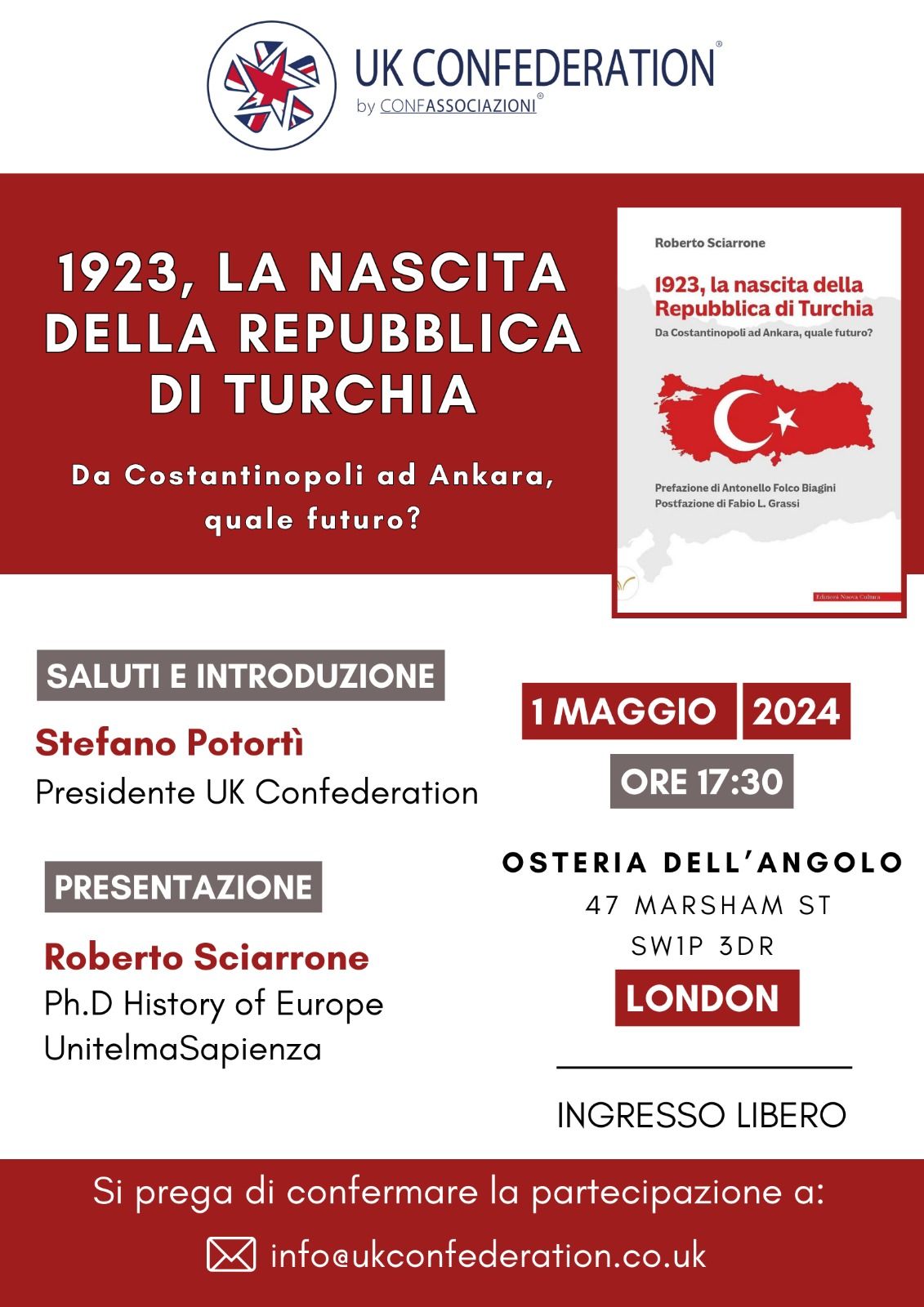 L'importanza di questo momento storico è il fulcro di un incontro che si terrà il 1° Maggio alle 17.30 presso l'Osteria dell'Angolo a Londra (47 di Marsham St, SWIP 3DR). L'evento, organizzato da UK Confederation riunirà esperti e appassionati per discutere della nascita della Repubblica di Turchia, esplorando il passato, il presente e il futuro di questa Nazione. Al centro dell’incontro ci sarà la presentazione del libro “1923, La Nascita della Repubblica di Turchia: da Costantinopoli ad Ankara, quale futuro?”.
