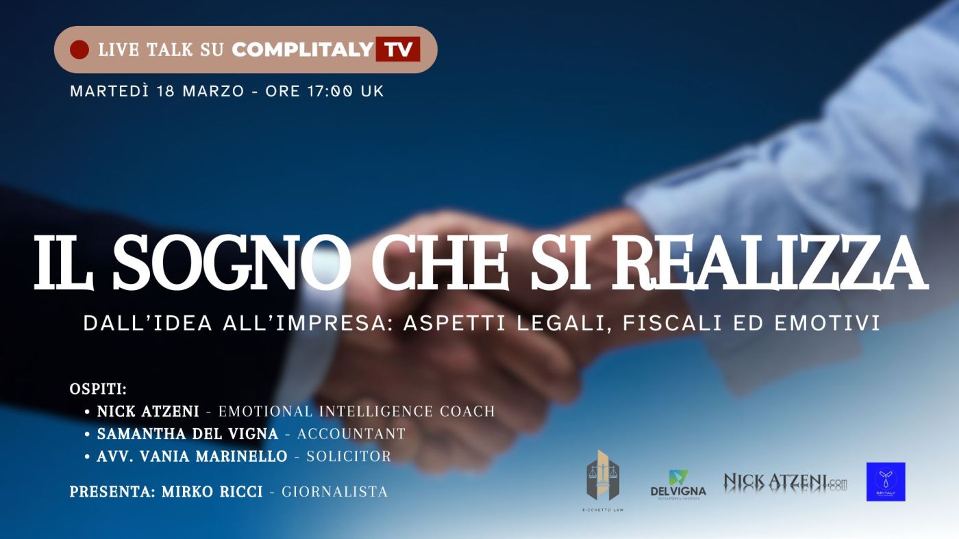 Martedì 18 marzo alle ore 17:00 (UK time) andrà in onda su Complitaly TV un evento imperdibile per chi desidera trasformare un'idea in un'attività imprenditoriale di successo. Durante la diretta, esperti del settore analizzeranno gli aspetti legali, finanziari ed emotivi necessari per affrontare il percorso imprenditoriale con consapevolezza e preparazione.