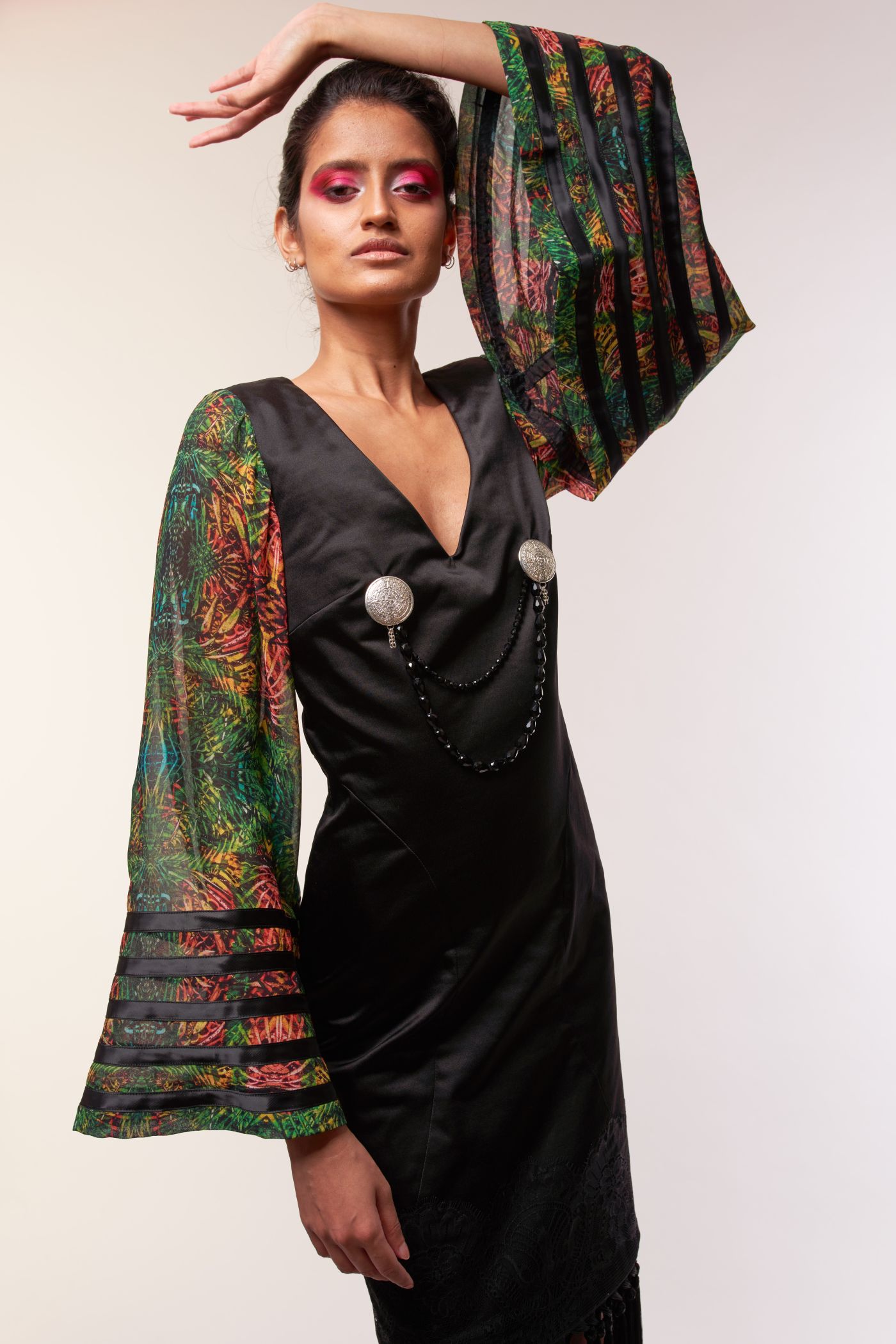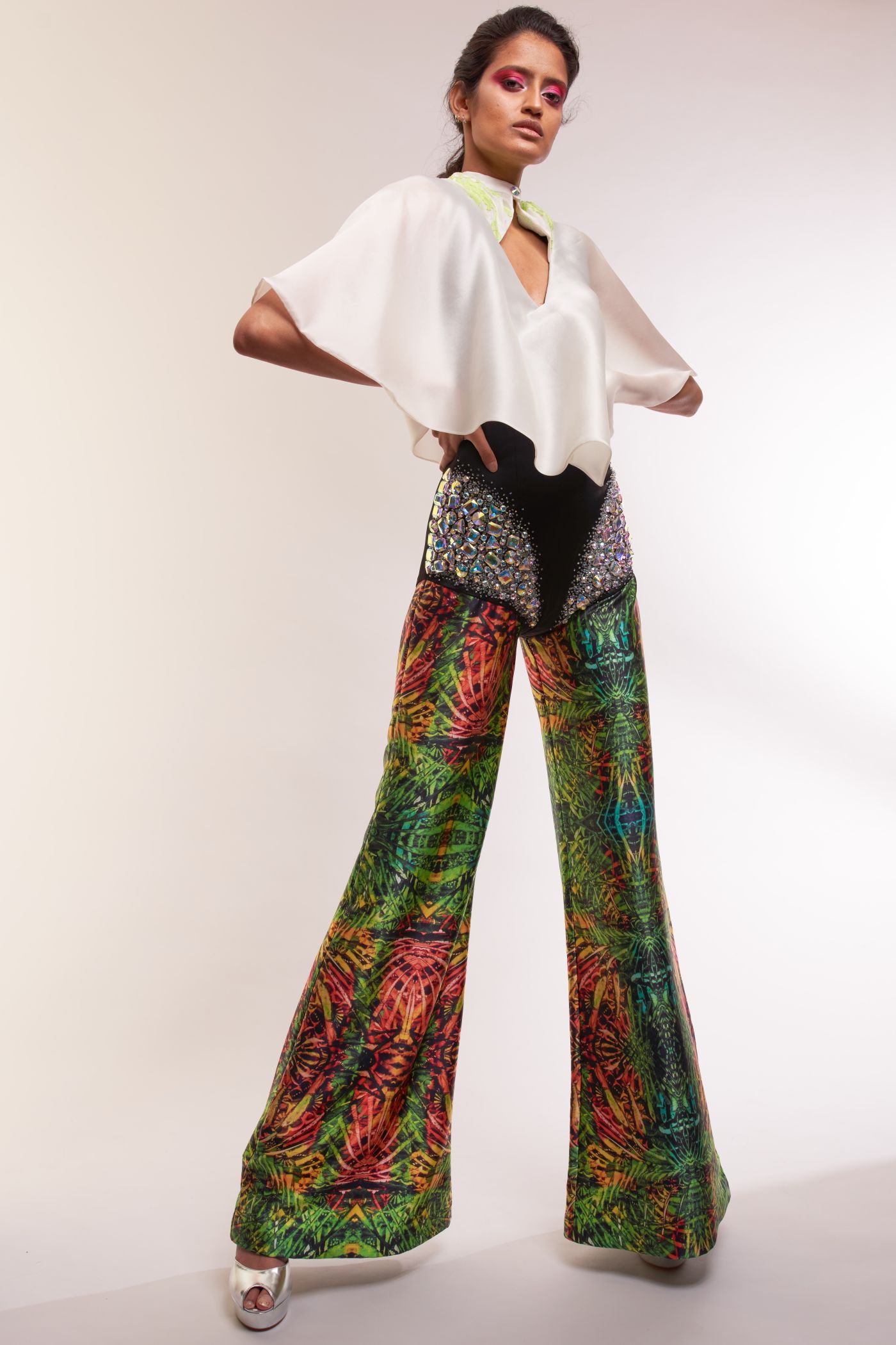 I tessuti di seta stampata sono frutto di collaborazioni artistiche con pittori e graphic designer emergenti. Gli accessori, come le spille in argento, sono stati realizzati da artigiani messicani su mia richiesta. I ricami sono rigorosamente eseguiti a mano da ricamatrici dell’alta moda romana.