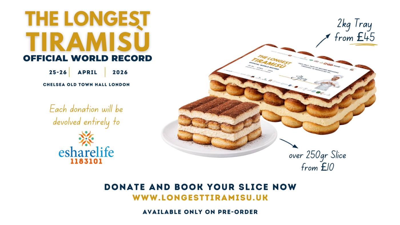 Ancora prima dell’inizio ufficiale, The Longest Tiramisù – Guinness World Record Official Attempt sta già facendo la differenza. Sono state infatti superate le £3.000 raccolte e donate alla Esharelife Foundation, a sostegno di persone in difficoltà.