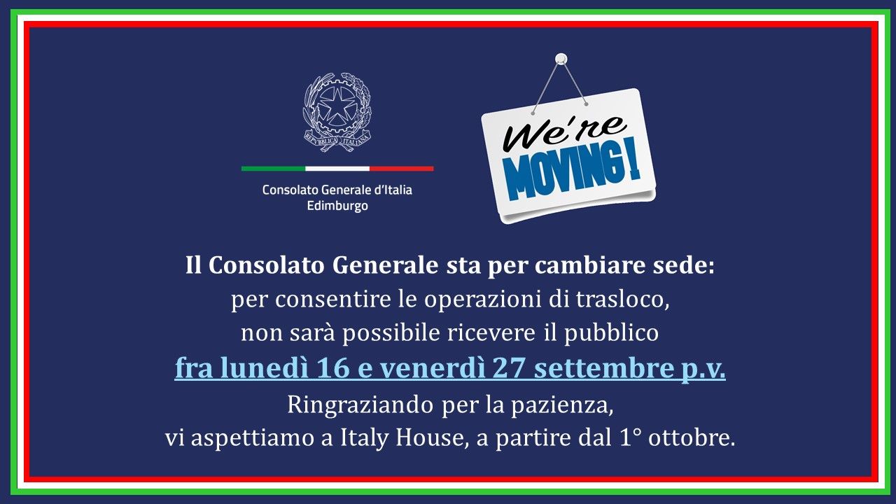 A partire dal mese di Settembre, il Consolato Generale d'Italia a Edimburgo cambierà sede, trasferendosi dall'attuale indirizzo in Melville Street al nuovo e moderno edificio denominato Italy House, situato al 20-22 East London Street, EH7 4BQ. Dal 1° Ottobre, i cittadini italiani residenti in Scozia potranno usufruire dei servizi consolari in una struttura più accogliente e confortevole.