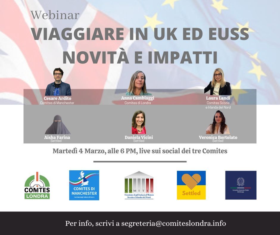 Dopo un'introduzione a cura dei coordinatori Laura Landi (Comites Scozia e Irlanda del Nord), Anna Cambiaggi (Comites Londra) e Cesare Ardito (Comites Manchester), interverranno le relatrici Aisha Farina, Daniela Vicini e Veronica Bortolato di Settled, organizzazione fondata nel 2019 per supportare i cittadini dell'UE i cui diritti sono stati modificati dalla Brexit.
