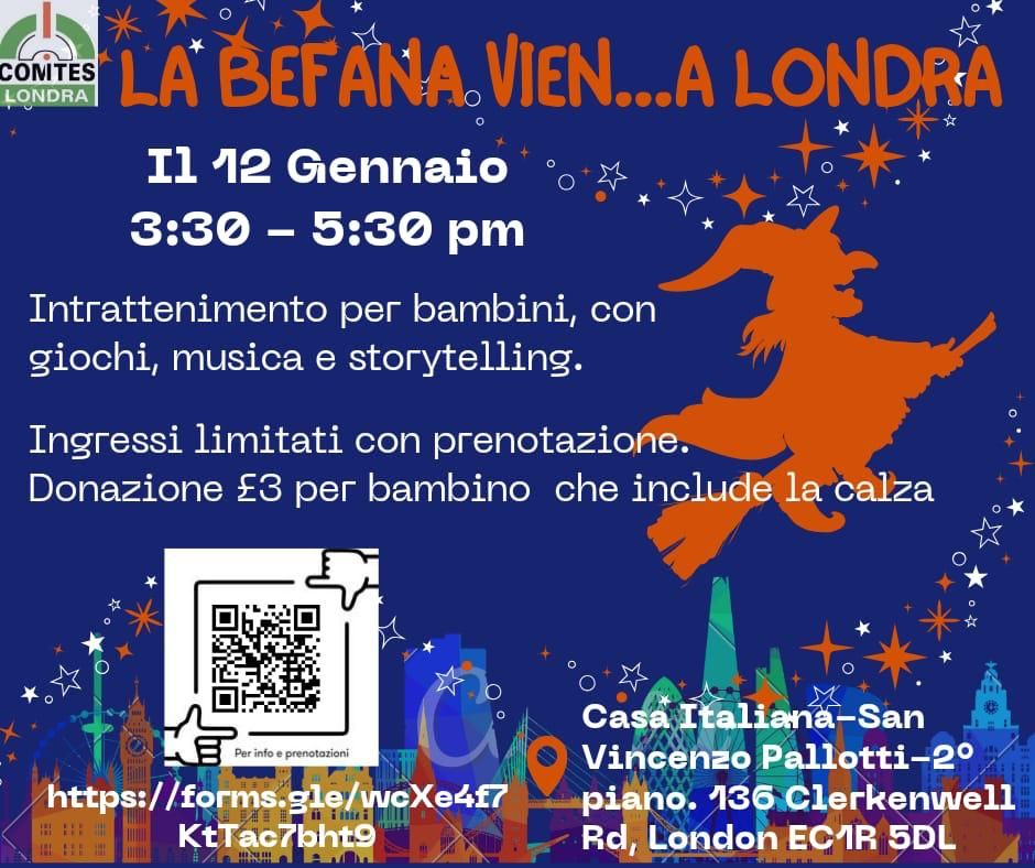 Anche a Londra la tradizione della Befana non manca! Domenica 12 gennaio, il Comites di Londra, insieme al Gruppo Giovani Famiglie della St Peter's Italian Church, organizza un evento speciale per festeggiare questa tradizione tanto amata dai bambini italiani. Il pomeriggio di divertimento e magia avrà luogo presso la Casa Italiana-San Vincenzo Pallotti, al secondo piano, in Clerkenwell Road, un angolo di Italia nel cuore della capitale britannica. L'evento è andato sold-out in pochissimo tempo.