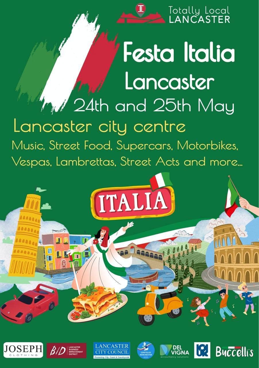 Il Gran Finale si terrà domenica 25 maggio, a partire dalle 10:30, trasformando ancora una volta Lancaster in una piccola Italia. Questa giornata offrirà un ricco programma di intrattenimento a tema italiano, inclusi street food come pizza, pasta, arancini, piadine, dolci tipici e perfino fudge italiano. Non mancherà un'area bar con birre, gin e prosecco italiani, perfetta per chi vuole concedersi un brindisi domenicale.
