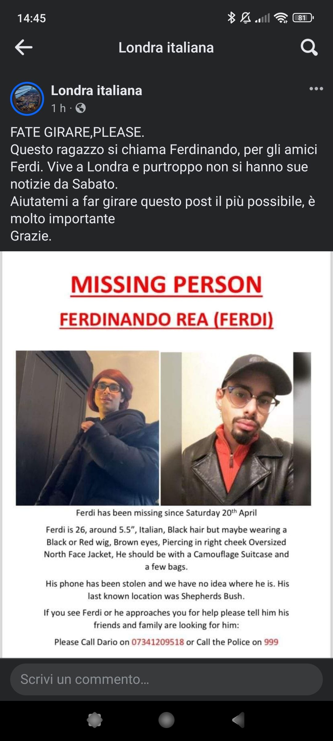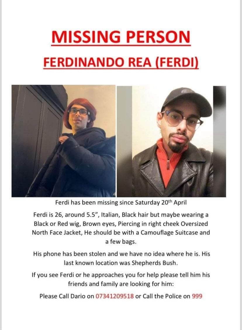 L'appello disperato dei cari di Ferdinando si è diffuso rapidamente attraverso i canali social di italiani a Londra, chiedendo a chiunque abbia informazioni utili di contattare immediatamente le autorità competenti.