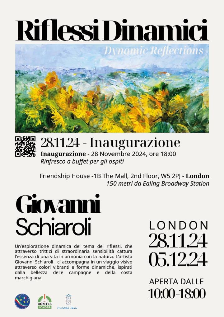 Londra è pronta ad accogliere un evento artistico di grande rilievo: la mostra "Riflessi Dinamici" di Giovanni Schiaroli, organizzata dal Circolo MIE di Londra con il patrocinio del COMITES di Londra e della Friendship House di Ealing. L’inaugurazione, fissata per il 28 novembre 2024 alle ore 18.00 presso la Friendship House (1B, The Mall, 2° Piano, W5 2PJ, Londra), offrirà un rinfresco a buffet per accogliere il pubblico in un ambiente di condivisione e scambio culturale.