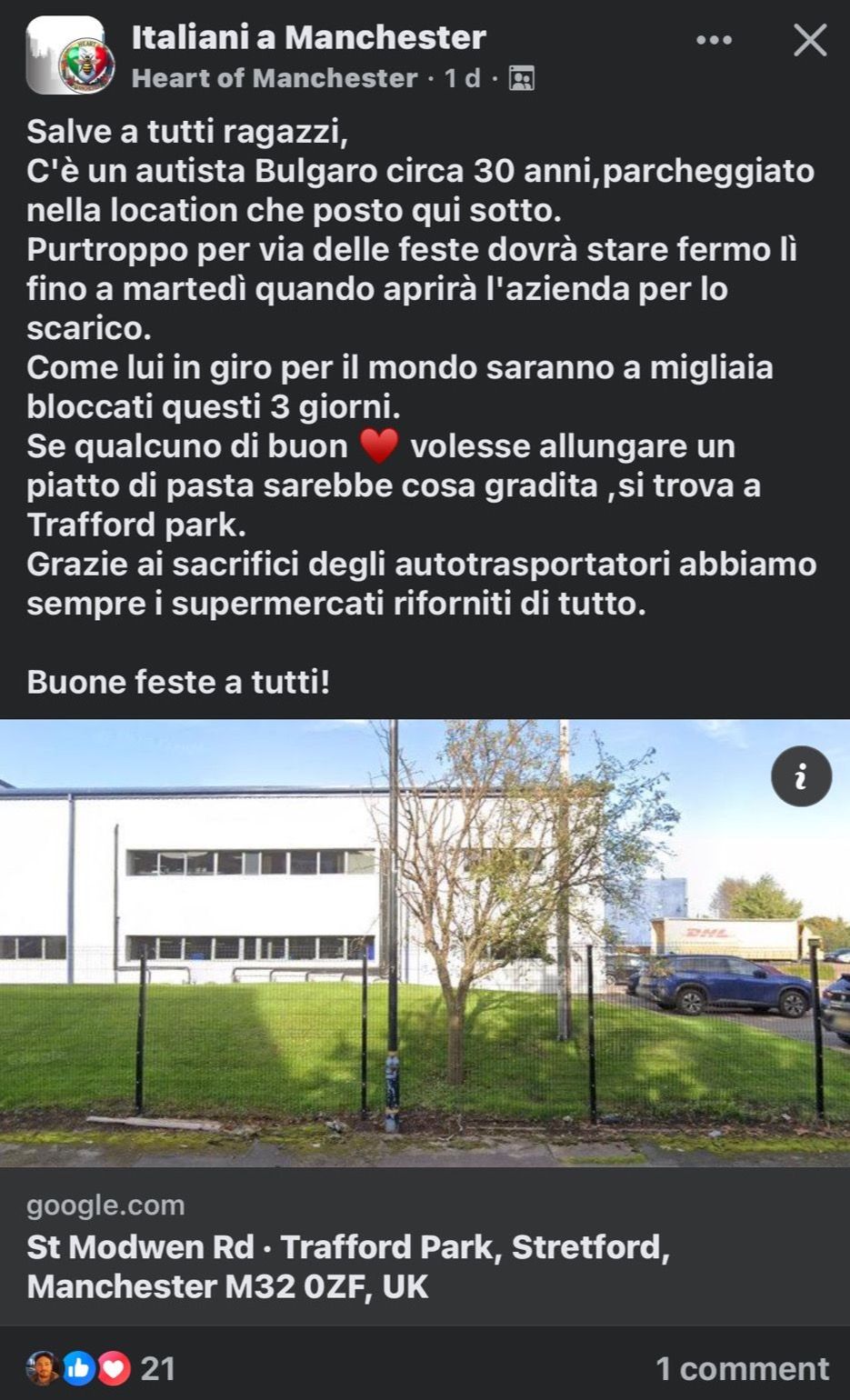 Il messaggio ha sortito un effetto immediato. Nonostante ieri fosse la Domenica di Pasqua, grazie all'iniziativa dei volontari dell'associazione “Heart of Manchester”, supportati dalla generosità della Comunità, non solo l'autista ha ricevuto pasti caldi, ma ha anche avuto accesso ai servizi igienici per potersi lavare. È un piccolo gesto che ha un impatto enorme sulla vita di quest'uomo che, lontano da casa e dalla famiglia, si trova a dover affrontare queste giornate di attesa forzata.