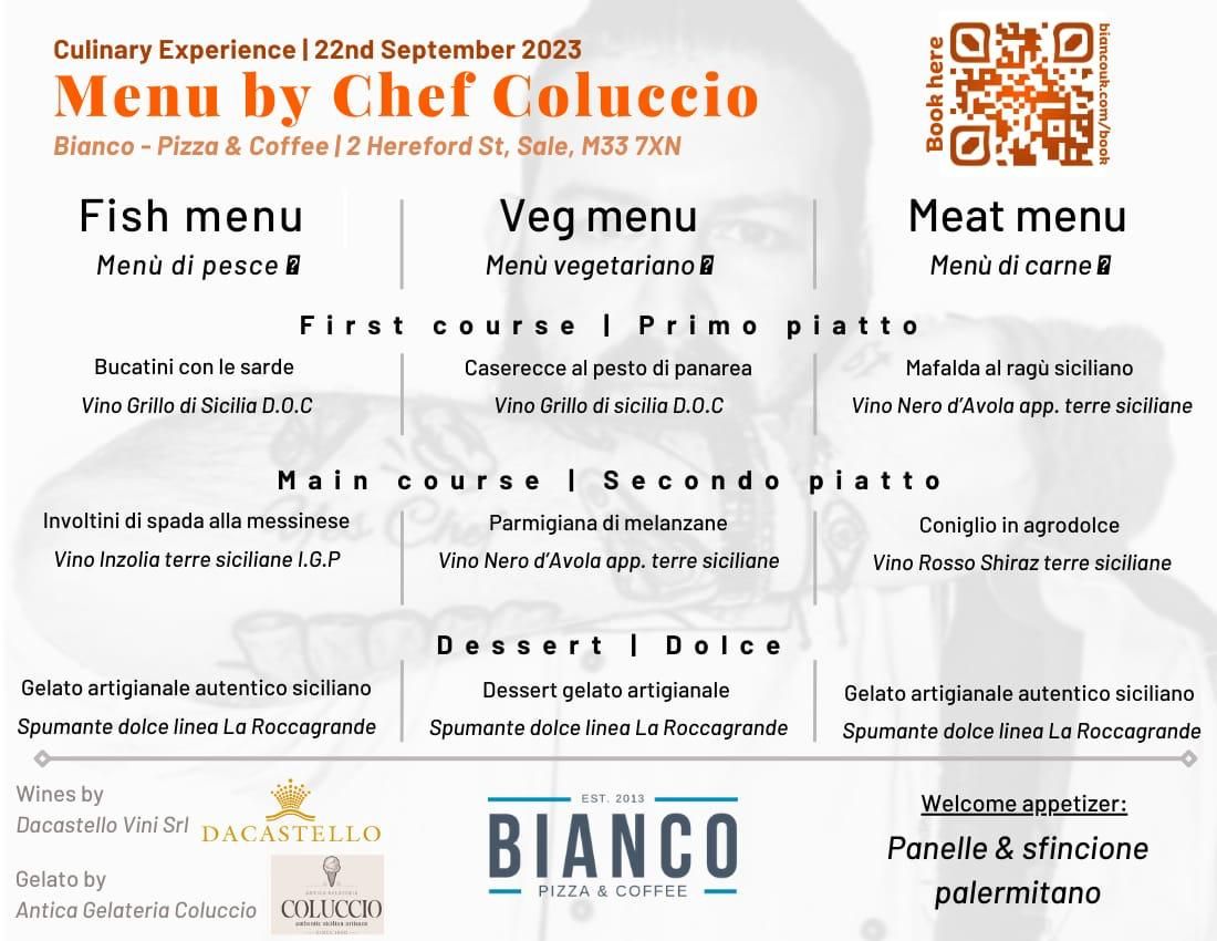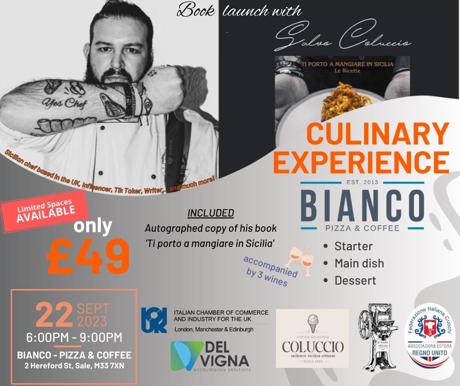 Il 22 Settembre presso Bianco - Pizza & Coffee di Sale, Manchester, si terrà una speciale serata di degustazione in compagnia dello Chef Salvo Coluccio. L’occasione sarà utile anche per scoprire il libro di ricette siciliane scritto da Coluccio.