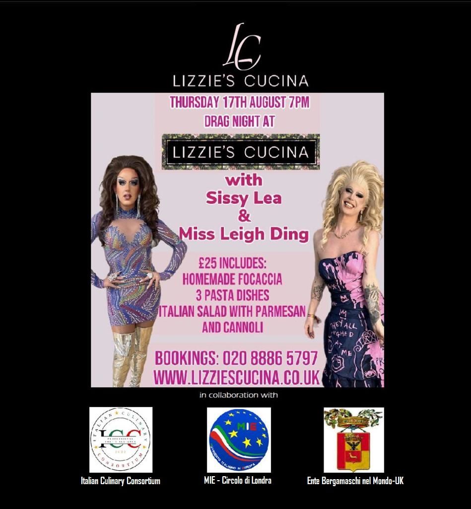 L'altro appuntamento è organizzato al Ristorante Lizzie's Cucina, con il patrocinio dell'ICC - Italian Culinary Consortium, del Circolo MIE di Londra e dell'Ente Bergamaschi nel Mondo UK. Giovedì 17 Agosto 2023, dalle ore 19 in poi, si terrà uno spettacolo della famosa Drag Queen Londinese, ma di origini siciliane, Sissy Lea. Sarà un evento straordinario, che celebrerà il talento italiano sia nella Cucina che nello spettacolo. Sissy Lea, il cui nome d'arte evoca la Regione di provenienza, la Sicilia, si esibirà insieme ad un'altra Drag Queen, Miss Leigh Ding, in uno spettacolo di intrattenimento della durata di un'ora e mezza. Il Ristorante Lizzie's, nell'occasione, ha preparato un menù speciale, una sorta di viaggio culinario attraverso sapori autentici italiani curati dallo chef Carmelo Carnevale. I posti saranno limitati. Per prenotazioni contattare direttamente il ristorante al numero 02088865797 o sul sito www.lizziescucina.co.uk.