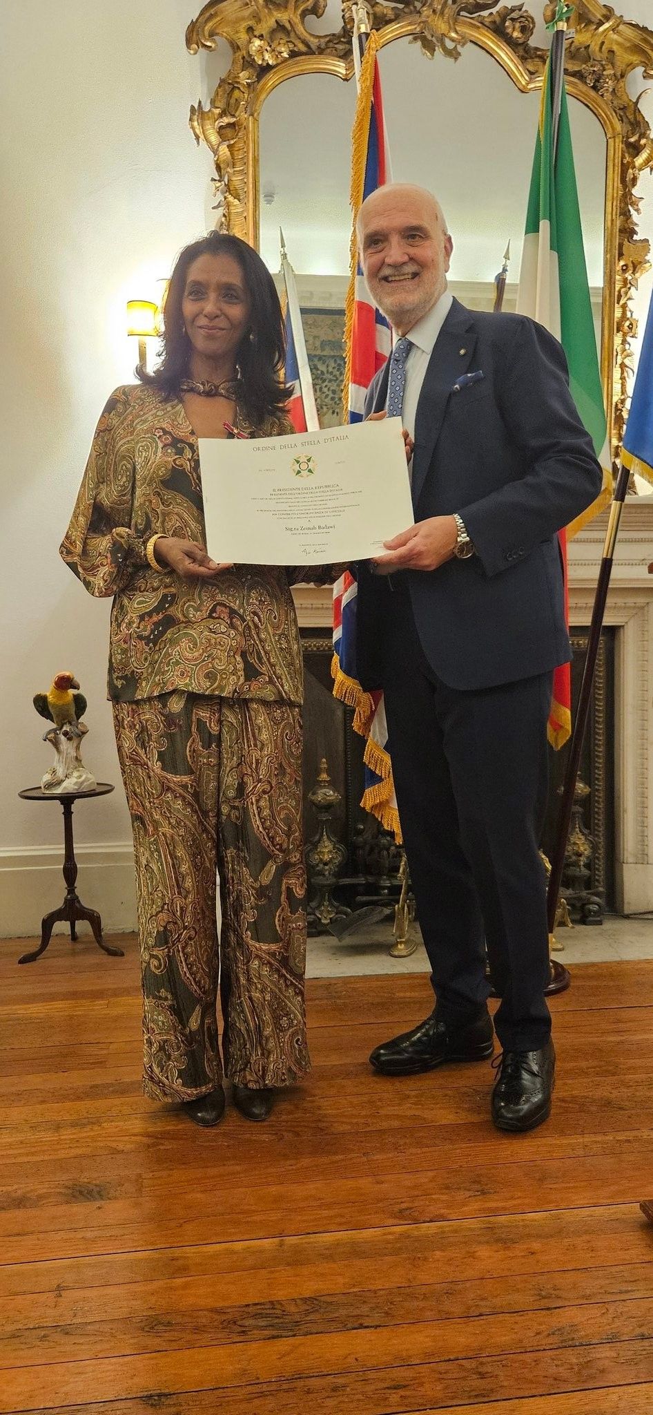 La serata ha avuto un momento speciale con il conferimento a Zeinab Badawi dell’onorificenza di Ufficiale della Stella d’Italia, riconoscimento assegnato dal Presidente della Repubblica per il suo contributo alla promozione della cultura italiana. L’Ambasciatore Lambertini ha ricordato il lavoro di Badawi nel celebrare l’opera italiana attraverso il suo programma "Take Me to the Opera" su BBC, che ha incluso approfondimenti su La Scala di Milano e interviste con artisti iconici come Cecilia Bartoli e Antonio Pappano.