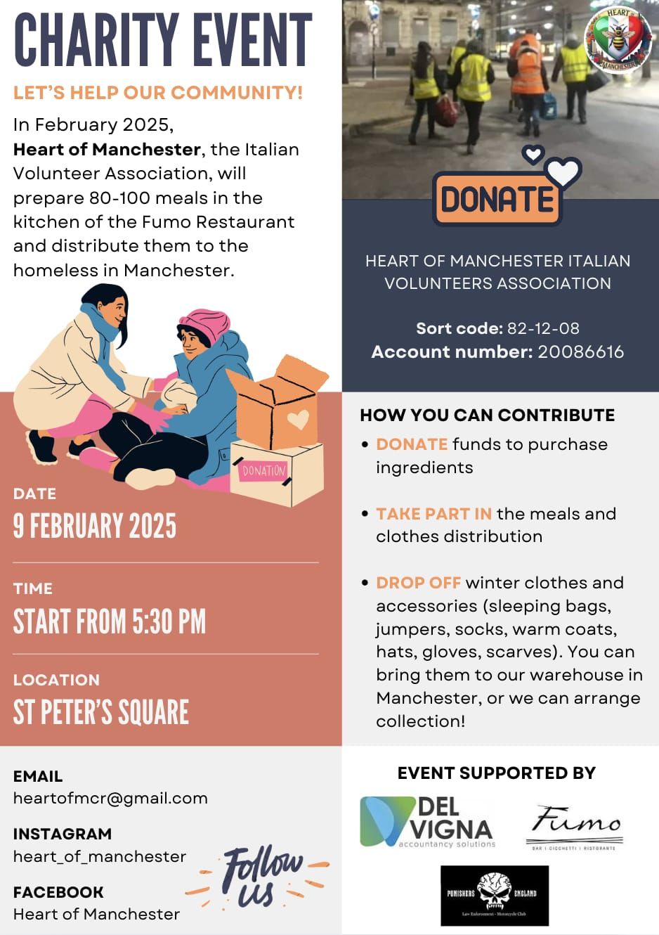 Questa associazione, animata da un gruppo di volontari appassionati, torna a offrire un gesto concreto a chi vive ai margini della società. In collaborazione con Fumo Restaurant, Del Vigna LTD e i carismatici motociclisti del club Punishers LE MC England Nomad di Manchester, Heart of Manchester si prepara a cucinare e distribuire circa 100 pasti caldi per i senzatetto della città, in aggiunta a vestiti invernali e sacchi a pelo.