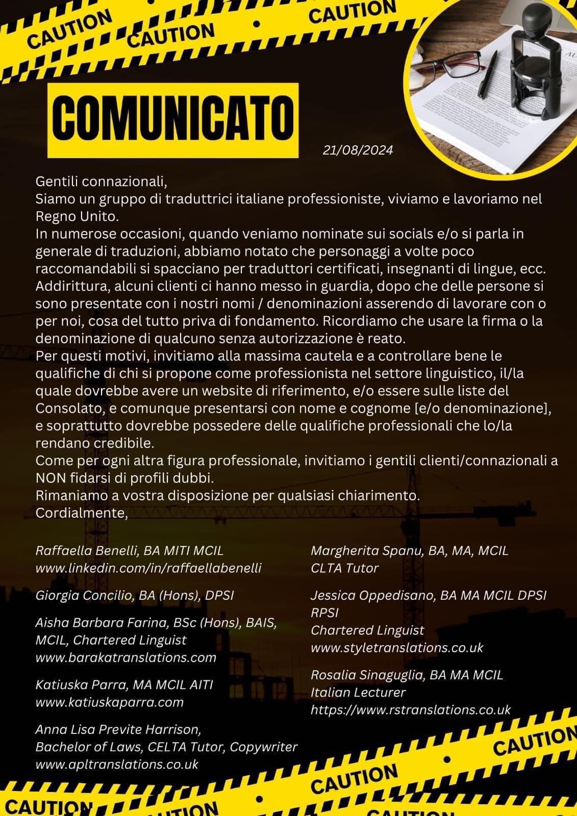 Sorpresa dall’accaduto, non avendo ricevuto alcun incarico, ha cercato di fare chiarezza scoprendo che le era stata rubata identità e firma da chi si spacciava di collaborare con un traduttore professionista. Subito è scattata la denuncia della traduttrice, la quale con un comunicato congiunto insieme ad altri professionisti mette in allerta la comunità italiana di stare molto attenta a chi si incontra nei gruppi social e online.