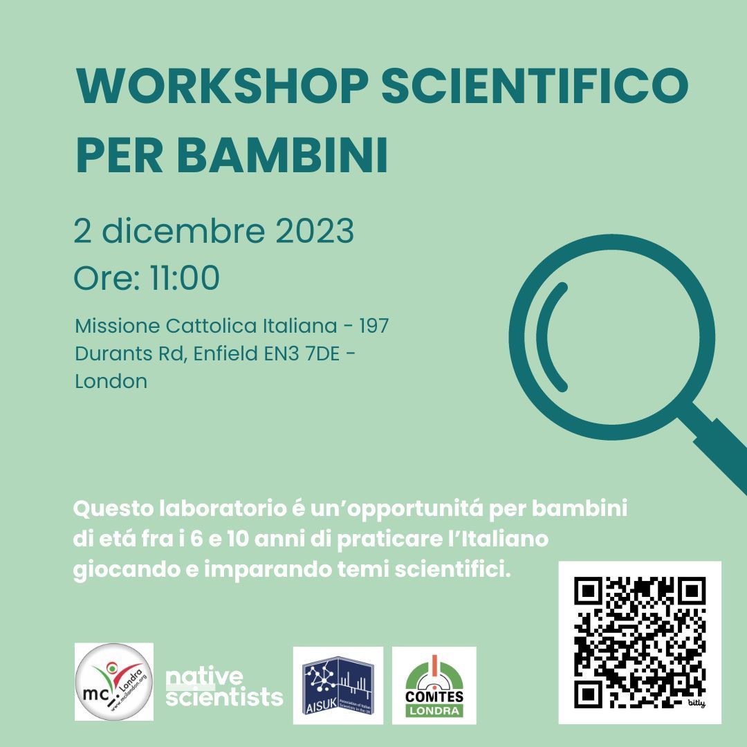 Il Comites Londra, con il supporto tecnico di Native Scientists, ha organizzato un emozionante workshop gratuito dedicato ai bambini dai 6 ai 10 anni desiderosi di esplorare il mondo attraverso la Scienza. L'evento, che si terrà in italiano, avrà luogo a Londra sabato 2 dicembre dalle 11:00 alle 13:00 presso le sale della Missione Cattolica Italiana (97 Durants Rd, Enfield EN3 7DE).