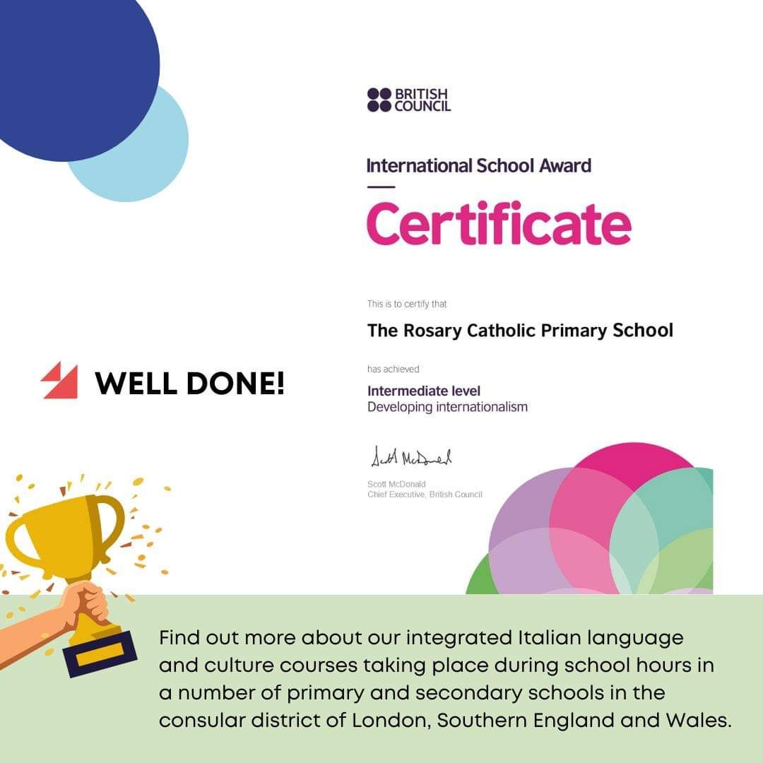 In questo contesto, la Rosary Catholic Primary School ha recentemente raggiunto un importante traguardo, ottenendo il British Council International School Award Intermediate Certificate. Questo riconoscimento è il risultato del lavoro instancabile dell’insegnante Alice Cerruti, che ha sviluppato con successo corsi di lingua italiana all'interno del curriculum scolastico. Questo prestigioso certificato riconosce l’impegno della scuola nell’internazionalizzazione dell’educazione e nella promozione della diversità linguistica e culturale.