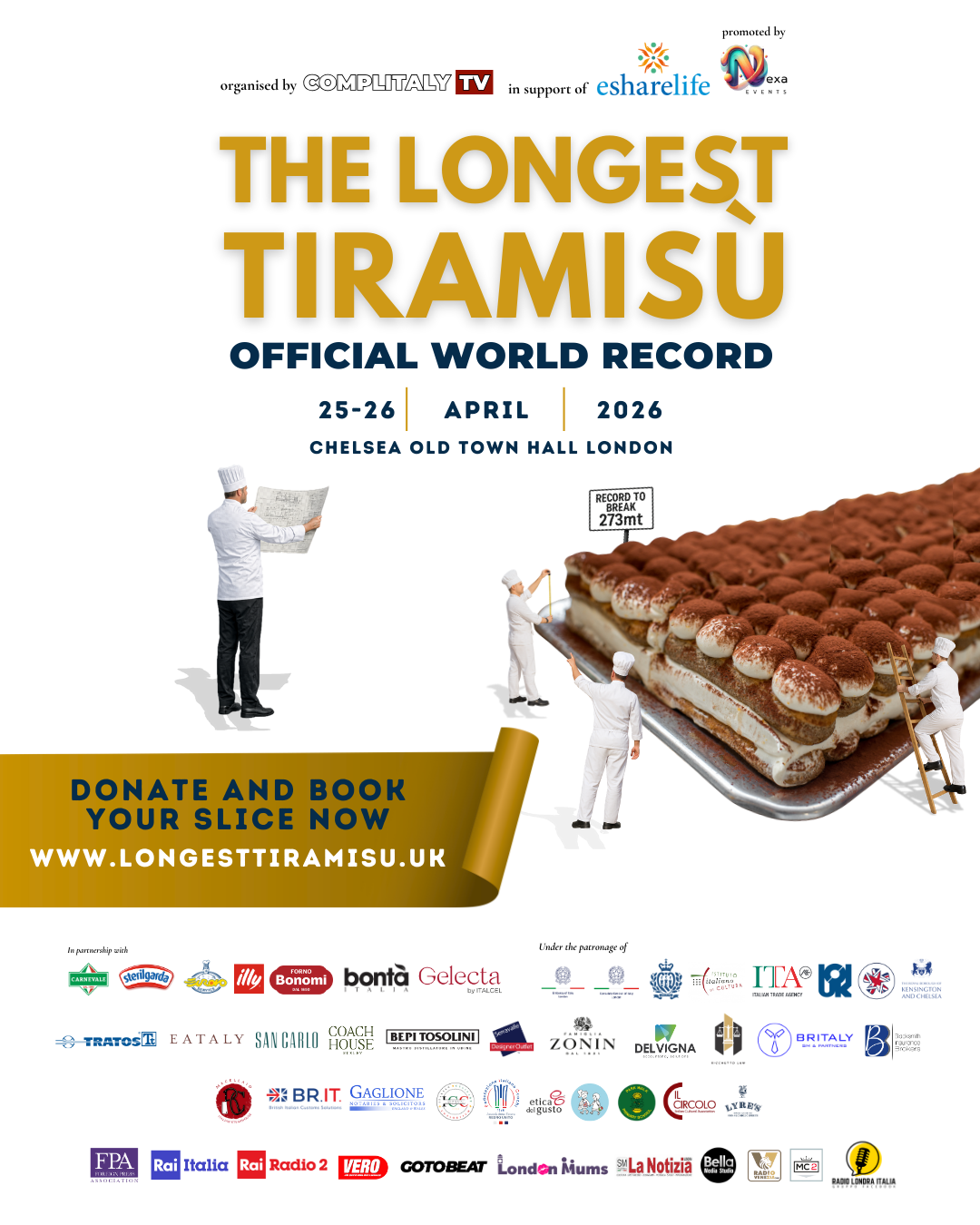 Due appuntamenti chiave che anticipano l’evento principale del 25 e 26 aprile 2026 alla Chelsea Old Town Hall di Londra, dove verrà realizzato il tiramisù più lungo del mondo, oltre 300 metri di dolcezza italiana sotto la supervisione dei giudici ufficiali del Guinness World Records.