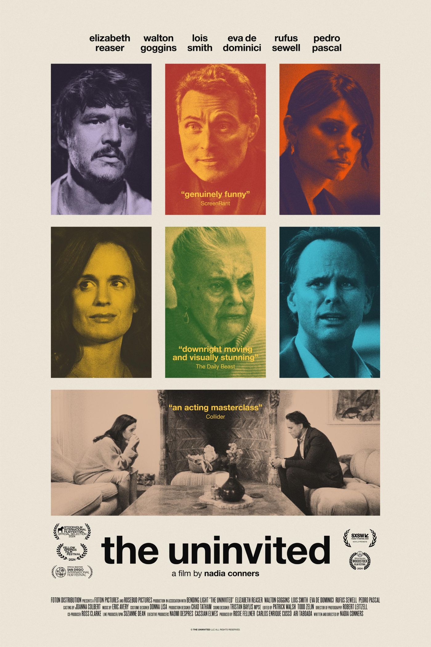 "The Uninvited" is a dramedy directed by Nadia Conners, starring Elizabeth Reaser, Walton Goggins, Pedro Pascal, Rufus Sewell, Eva De Dominici, and Lois Smith. Premiered at the South by Southwest Film Festival on March 11, 2024, the film is set for a UK theatrical release on May 9, 2025.