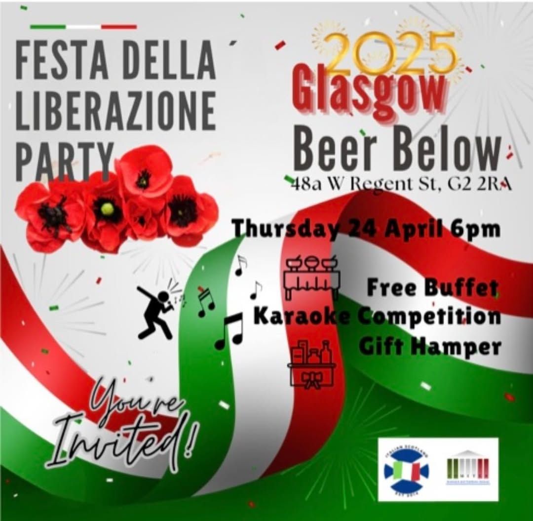 La comunità italiana di Scozia e Irlanda del Nord si prepara a celebrare la Festa della Liberazione con un evento speciale organizzato dall'associazione ItalianScotland, Comites di Scozia e Irlanda del Nord e Beer Below. La serata, pensata per unire tradizione, convivialità e divertimento, si terrà giovedì 24 aprile presso il Beer Below, situato al 48a W Regent St. - G2 2RA, Glasgow. L’ingresso è gratuito e non è richiesto alcun biglietto.