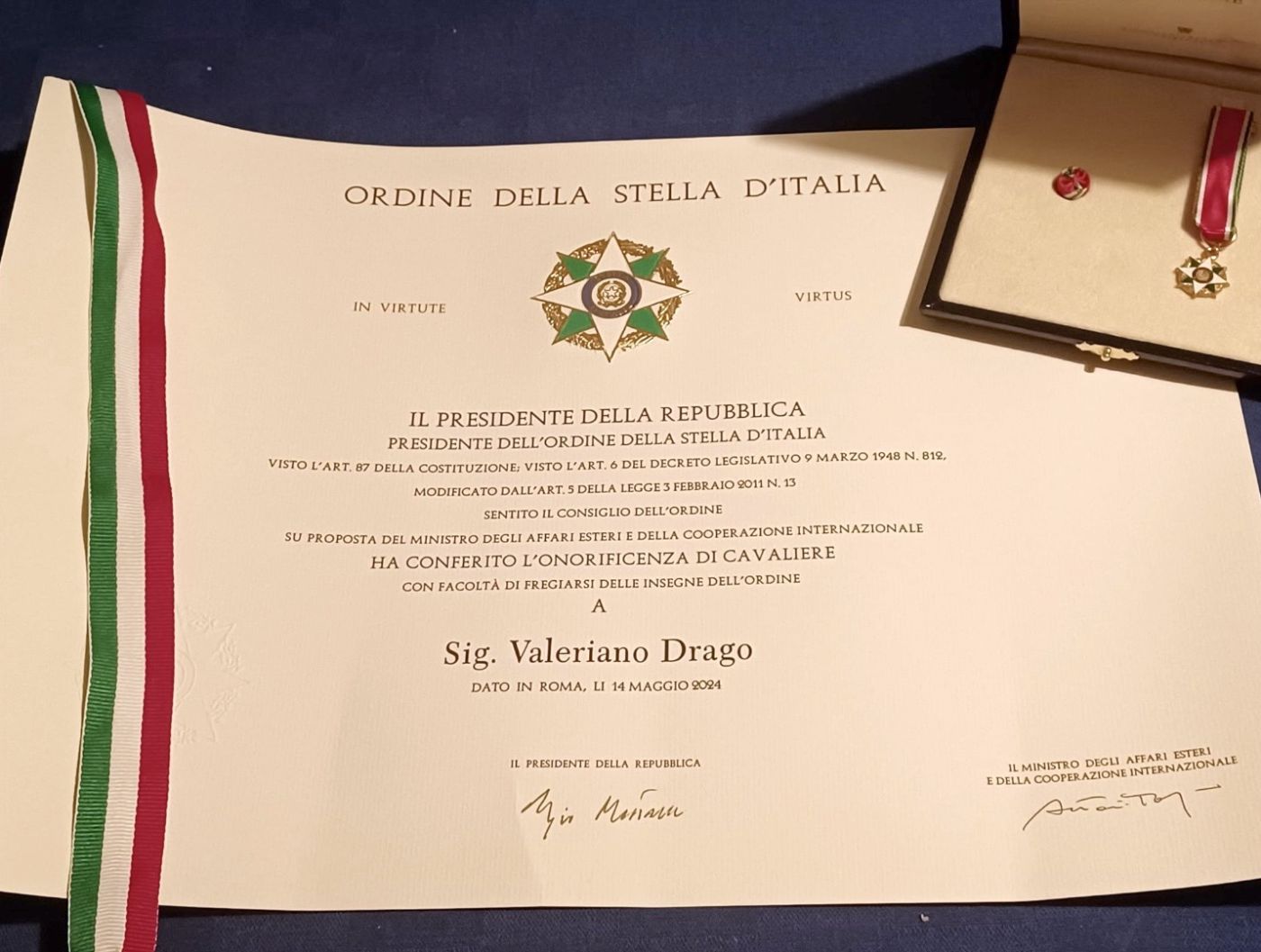 Valeriano Drago nominato Cavaliere dell'Ordine della Stella d'Italia