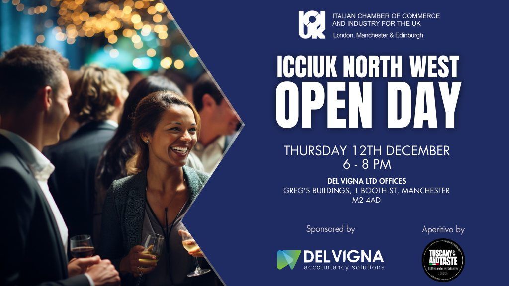 La Camera di Commercio e Industria Italiana per il Regno Unito (ICCIUK) invita imprenditori, professionisti e appassionati del business italo-britannico all’esclusivo Open Day di Manchester, che si terrà giovedì 12 dicembre, dalle 18:00 alle 20:00, presso gli uffici di Del Vigna, situati al Greg’s Buildings, 1 Booth Street, di Manchester.